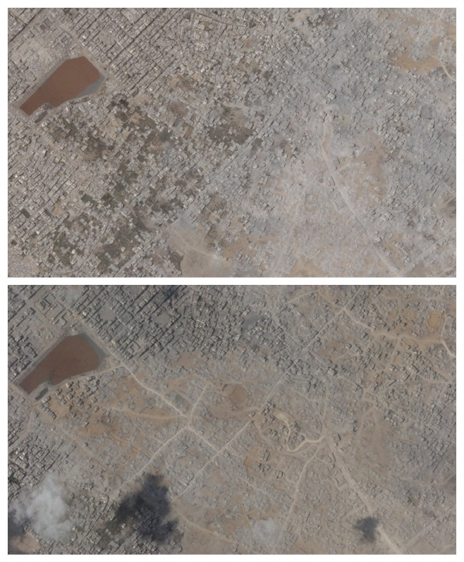 위성 사진은 2025년 8월 20일(위)과 2025년 9월 18일(아래) 가자 시티 셰이크 라드완 지역 피해 지역을 보여준다./로이터 연합 |