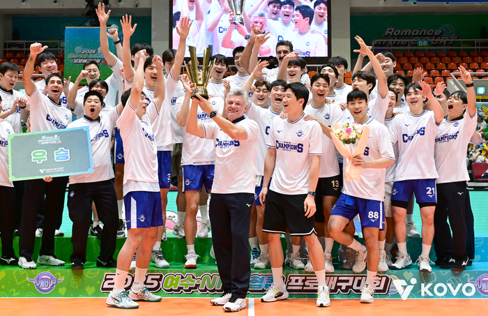 헤난 달 조토 감독이 이끄는 대한항공은 20일 전남 여수 진남체육관에서 열린 2025 여수·NH농협컵 프로배구대회 남자부 OK저축은행과 결승전에서 세트 스코어 3-0(25-21 25-23 25-16)으로 꺾었다. 대한항공은 2022년 순천 대회에 이어 3년 만에 컵 대회 정상에 섰다.
