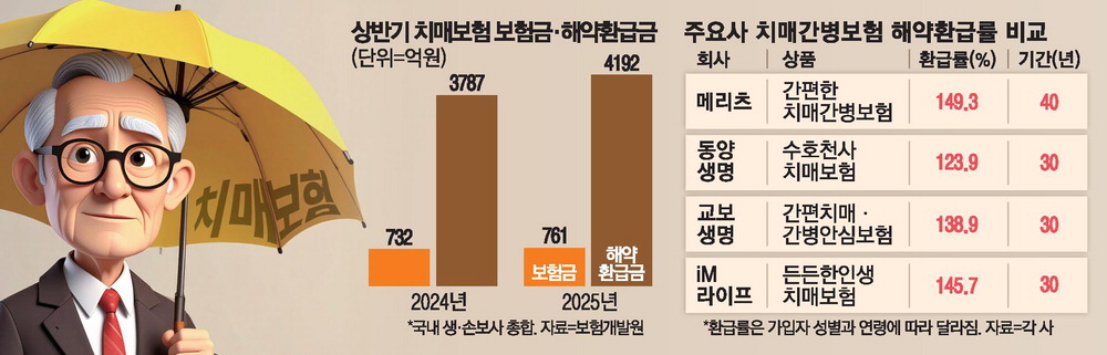 하지만 치매 관련 보험이 여전히 제대로 시장에 안착하지 못하고 있다는 평가가 나온다. 실제 치매 진단 후 지급된 보험금보다 해약으로 인한 환급금이 5배나 많은 것으로 나타났다. 올 상반기 치매·장기간병 상품에서 나간 보험금은 761억원인 데 비해 해약환급금은 4192억원에 달한다. 특히 보험금 수령이 2년 새 약 50억원 불어나는 동안 해약환급금은 그 10배에 달하는 600억원가량 신장했다.