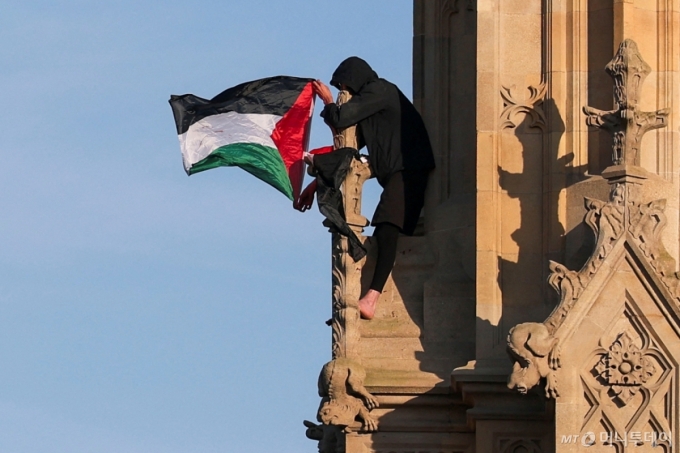 지난 3월8일(현지시간) 영국 런던 빅벤 타워에서 한 남성이 맨발로 올라가 팔레스타인 국기를 흔들고 있다. /런던 로이터=뉴스1 |