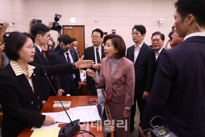 [이데일리 노진환 기자] 추미애 법제사법위원장이 22일 오전 서울 여의도 국회에서 열린 법제사법위원회 전체회의에서 질서유지권 발동에 항의하는 나경원, 곽규택 국민의힘 의원 등을 제지하고 있다. 이날 열린 법사위 전체회의에서 국민의힘 의원들은 회의 시작 전 의원석 노트북에 부착한 피켓을 철거하라는 추 위원장의 발언을 거부했다.