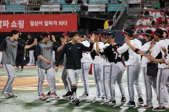 [서울=뉴스핌] LG 선수들이 지난 18일 수원 kt와의 더블헤더 2차전에서 승리한 뒤 하이파이브 하고 있다. [사진 = LG] 2025.09.18 wcn05002@newspim.com |