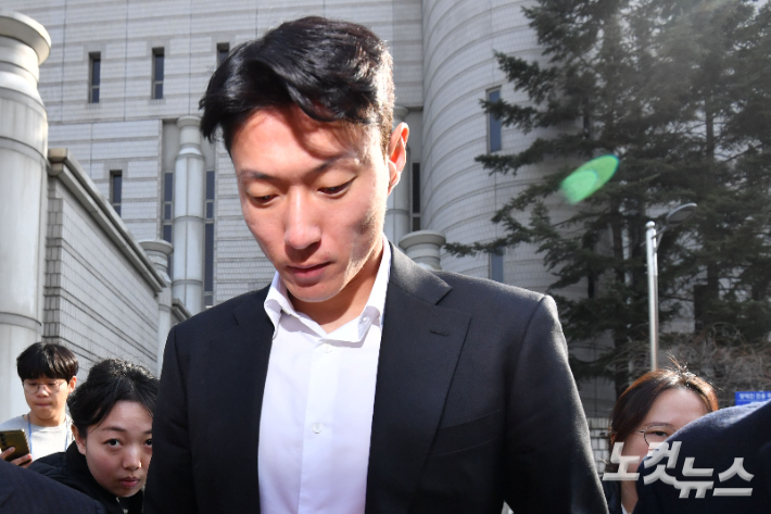 불법 촬영 혐의로 재판에 넘겨진 축구선수 황의조가 14일 오후 서울 서초구 서울중앙지방법원에서 열린 1심 선고 공판에서 징역 1년에 집행유예 2년을 선고 받은 후 법원을 나서고 있다. 류영주 기자 |