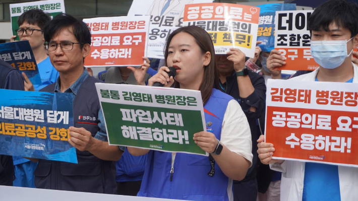 공공운수노조 의료연대본부 서울지부 서울대병원분회는 22일 서울대병원 본관 앞에서 기자회견을 열고 "지난 6월부터 16차례 단체교섭과 49차례 실무교섭을 진행했지만 병원 측은 핵심 요구에 어떤 수용안도 내놓지 않았다"며 "김영태 병원장은 노조가 파업에 돌입해야만 교섭에 나서겠다는 무책임한 태도로 일관하고 있다"고 비판했다.