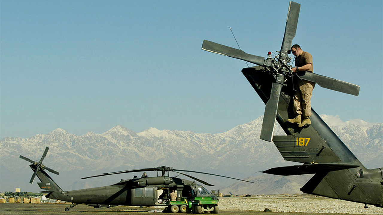 ▲ 2003년 1월 31일, 육군 경사가 아프가니스탄 바그람 군사 기지 비행 갑판에서 작업하고 있다.