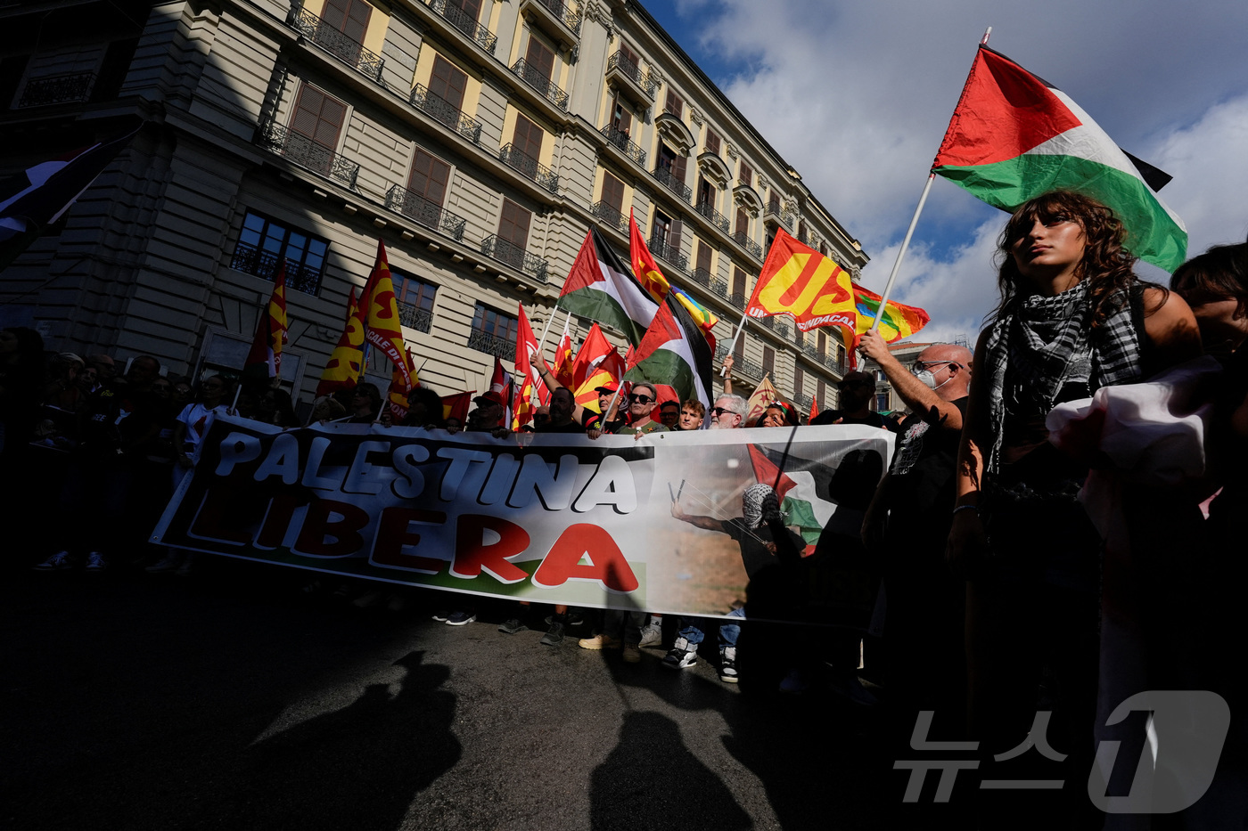 (나폴리 로이터=뉴스1) 권준언 기자 = 22일(현지시간) 이탈리아 나폴리에서 '팔레스타인 해방'이 적힌 현수막을 들고 있는 시위대. 시위는 이탈리아 노조 USB의 소집으로 벌어졌으며, "모든 것을 봉쇄하자"라는 구호를 내걸었다. 이들은 가자지구에 대한 연대와 이스라엘로의 무기 운송 중단을 촉구하며 전국 파업에 나섰다. 2025.09.22. ⓒ 로이터=뉴스1