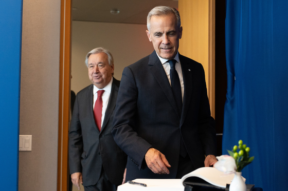 마크 카니(오른쪽) 캐나다 총리가 21일(현지시간) 미국 뉴욕 유엔본부에서 회담에 앞서 안토니우 구테흐스 유엔 사무총장(왼쪽)과 함께 입장해 방명록을 적고 있다. EPA=연합뉴스 |