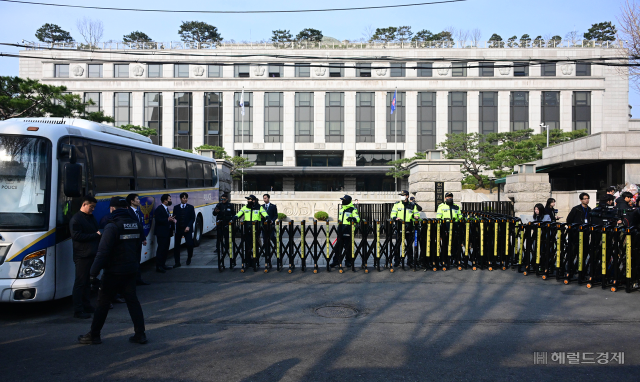 윤석열 전 대통령이 파면된 날이었던 지난 4월 4일 서울 종로구 헌법재판소 인근에 경찰 기동대원들이 분주하게 움직이고 있다. 이상섭 기자 |