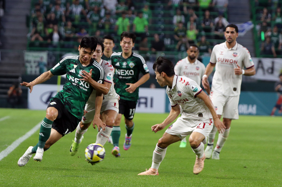 전북 현대 전진우(왼쪽)가 17일 수원FC전에서 문전으로 쇄도하고 있다. [연합뉴스] |