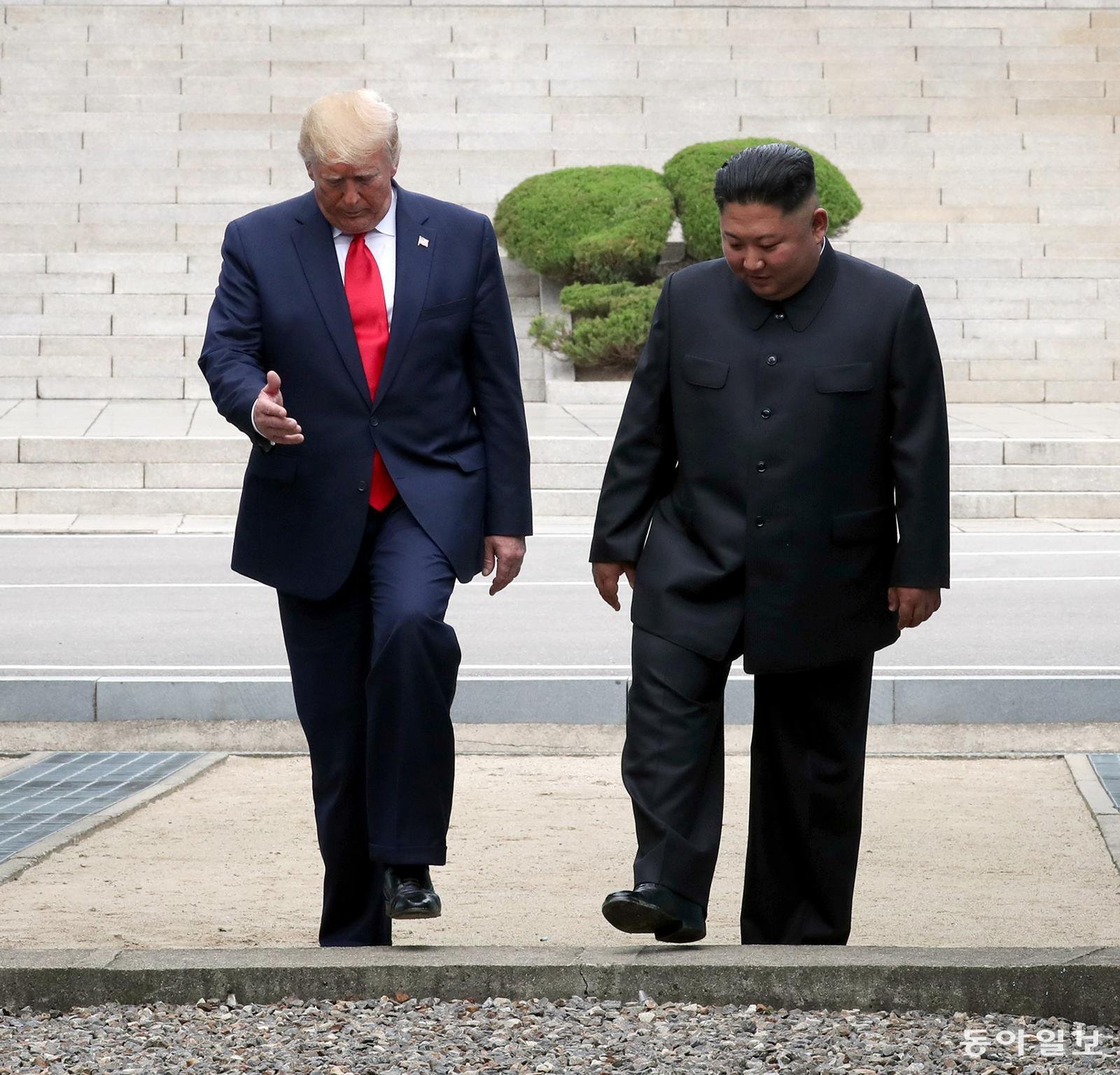 도널드 트럼프 미국 대통령(왼쪽)과 김정은 북한 국무위원장이 2019년 6월 30일 판문점에서 만나 군사분계선을 넘어 남측 자유의 집으로 이동하고 있다. 판문점=박영대 기자 sannae@donga.com |