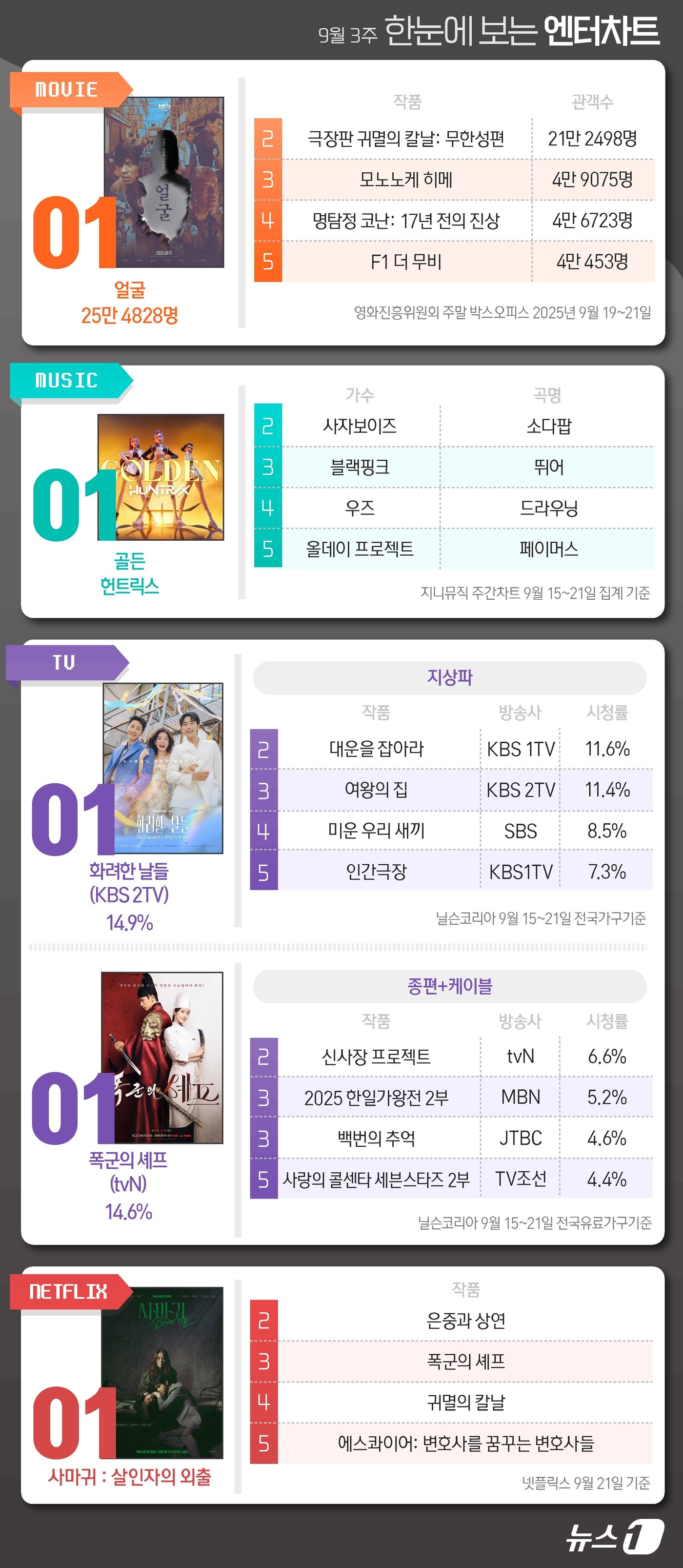 ◇ 영화='얼굴' 1위(영화진흥위원회 영화관 입장권 통합 전산망 2025년 9월 19~21일)