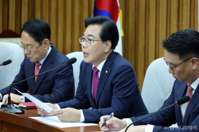 [서울=뉴시스] 고승민 기자 = 송언석 국민의힘 원내대표가 23일 서울 여의도 국회에서 열린 원내대책회의에서 발언하고 있다. 2025.09.23. kkssmm99@newsis.com /사진=고승민 |
