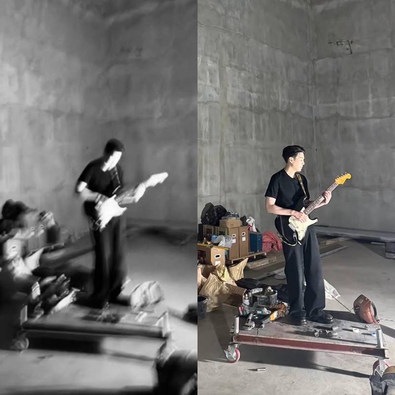 공개된 사진에서 슈가는 뒤에 짐이 쌓여있는 한 공간에서 기타를 연주하고 있는 모습이다. 그는 단정하게 자른 머리에, 검은색 티셔츠와 바지를 입고 남다른 분위기를 뽐내고 있어 시선을 사로잡았다.
