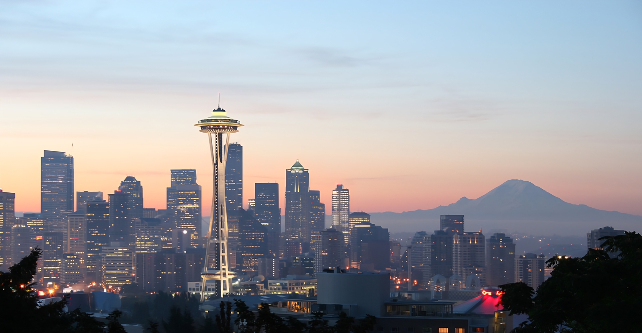 여명이 밝아오는 시애틀의 스페이스 니들과 멀리 보이는 레이니어산 |