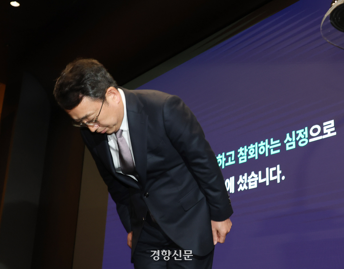 유영상 SK텔레콤 대표가 지난 7월4일 서울 중구 SK텔레콤 본사에서 기자회견을 열고 사이버 침해 사고에 대해 사과하고 있다. 성동훈 기자 |