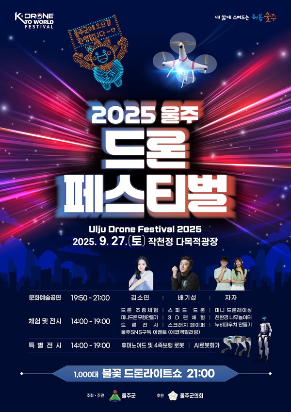 울주군 관계자는 "대한민국 대표 드론표준도시 울주에서 펼쳐지는 드론페스티벌을 통해 첨단 드론 기술을 눈으로 확인하시고, 멋진 드론쇼와 다양한 체험과 공연을 만끽하시길 바란다"고 말했다.