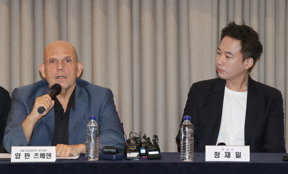 얍 판 츠베덴 서울시향 음악감독이 23일 서울 종로구 더프리마아트센터에서 열린 ‘2025 서울시향 신작 발표 기자간담회’에서 인사말을 하고 있다. 오른쪽은 작곡가 정재일. 연합뉴스 |