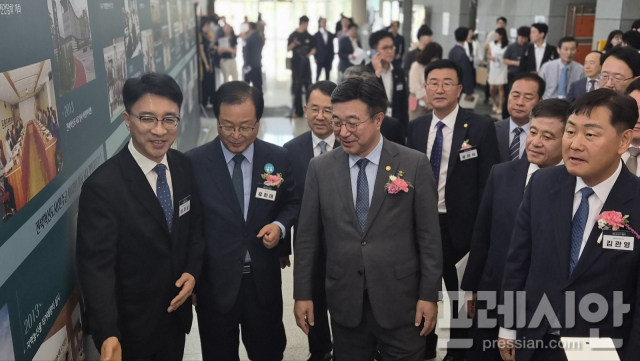 윤호중 행정안전부 장관이 지난 3일 완주군 이서면 지방자치인재개발원 개원 60주년 기념식에 참석해 김관영 전북지사, 유희태 완주군수 등과 전시 공간을 살펴보고 있다. ⓒ프레시안(양승수) |