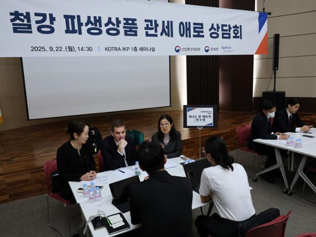 22일 오후 서울 서초구 대한무역투자진흥공사(KOTRA) 인베스트코리아플라자(IKP)에서 열린 철강 파생상품 관세 애로 상담회가 진행되고 있다. 뉴스1 |