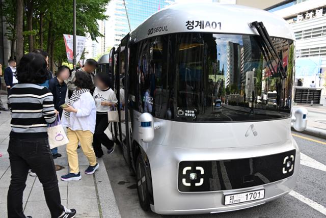 23일 서울 청계천변 도로. 긴급 상황에 대비해 차량 제어용 '조이스틱'을 든 시험 운전자가 승객과 나란히 좌석에 앉아 출발 버튼을 누르자 자율주행 셔틀버스 '청계A01'이 미끄러지듯 출발한다. 케이블카를 연상케 하는 형태와 크기의 전기버스로 수초 만에 시속 20km에 다다른다. 청계천변 인파, 을지로 상가에서 쏟아져 나오는 오토바이와 트럭에도 부딪힐 듯한 불안감이 느껴지는 순간은 없었다.