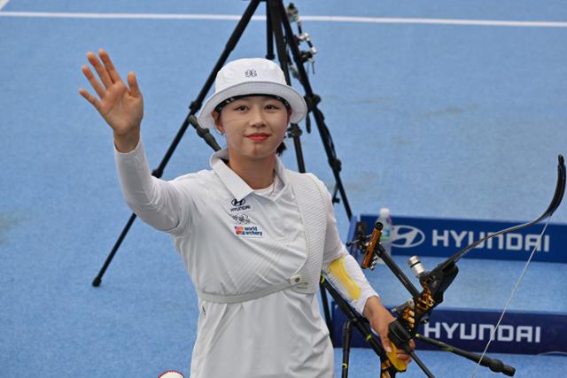 양궁 국가대표 임시현이 12일 광주 동구 5·18민주광장에서 열린 세계양궁선수권대회 리커브 여자 개인전 8강전을 치른 뒤 관중석을 향해 손을 흔들고 있다. 광주=뉴시스 |