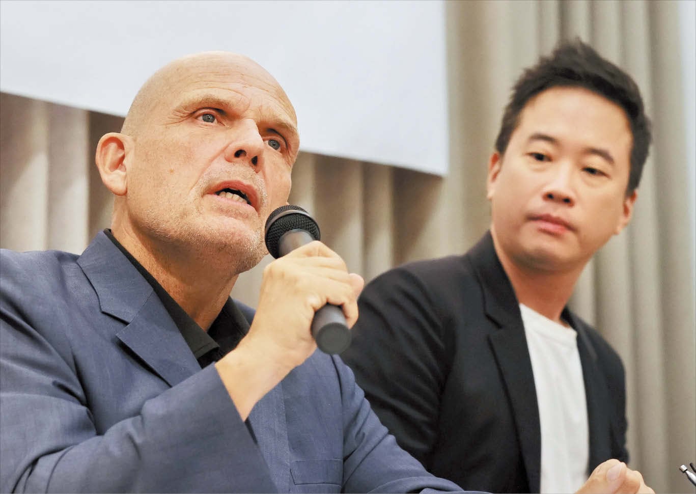 연합뉴스서울시향 음악 감독인 야프 판 즈베던(왼쪽)이 23일 ‘오징어 게임’과 ‘기생충’의 작곡가 정재일의 신곡 초연에 대해 설명하고 있다. |