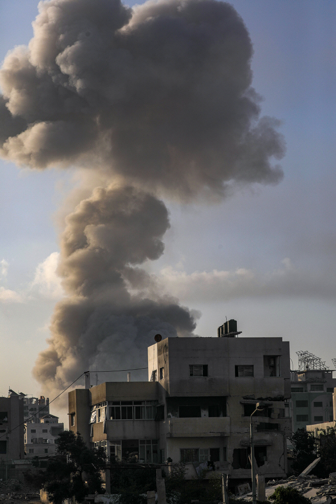 23일(현지시간) 가자시에서 이스라엘의 공습 후 연기가 피어오르고 있다./EPA 연합뉴스 |