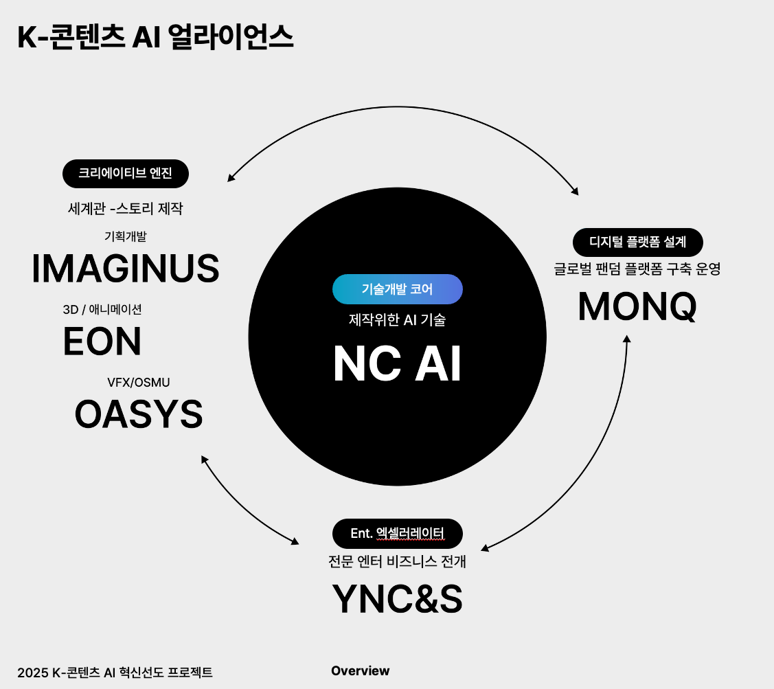 NC AI는 이번 프로젝트를 위해 각 분야 최고 전문기업들과 ‘K-콘텐츠 AI 얼라이언스’를 구성했다. ▷이매지너스(디즈니플러스 ‘북극성’ 제작사) ▷YN CULTURE&SPACE(문화공간 개발 및 엔터 테크 전문사) ▷스튜디오 이온(AI·언리얼 전문 3D 애니메이션 스튜디오) ▷오아시스 스튜디오(클라우드 기반 VFX) ▷몽규(글로벌 플랫폼 개발) 등과 협력해 기획-제작-확산 전주기에 걸친 혁신을 추진한다.