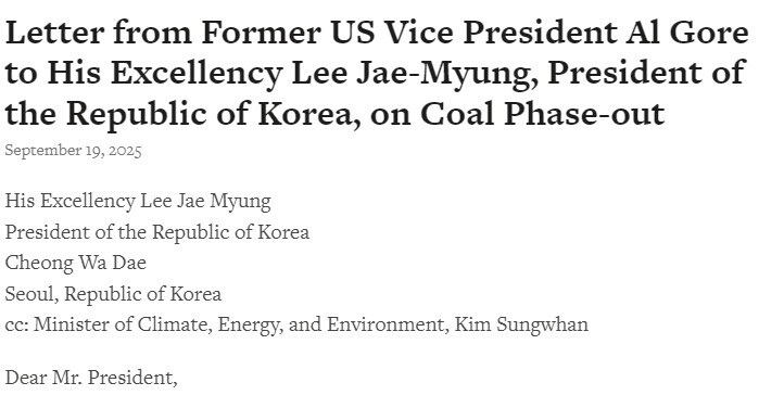 앨 고어 전 미국 부통령이 이재명 대통령에게 보낸 공개서한 일부. 여기엔 한국 탈석탄을 앞당길 것을 제안하는 내용이 담겼다. |