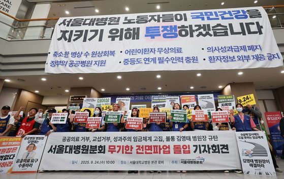 서울대학교병원 노동조합원들이 24일 서울 종로구 서울대병원에서 열린 서울대병원분회 무기한 전면 파업 기자회견에서 의료공공성 강화와 인력 충원 등을 요구하며 구호를 외치고 있다. 〈사진=연합뉴스〉 |
