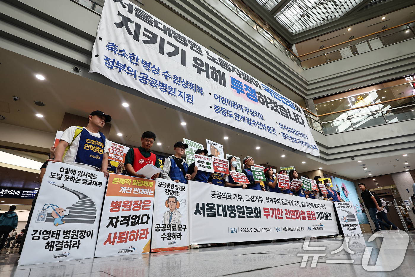 (서울=뉴스1) 김도우 기자 = 공공운수노조 의료연대본부 서울대병원분회 조합원들이 24일 서울 종로구 서울대학교병원에서 무기한 전면파업 돌입 기자회견을 하고 있다. 2025.9.24/뉴스1