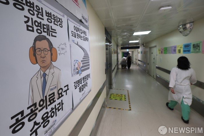[서울=뉴스핌] 김학선 기자 = 서울대병원 노조가 의료 공공성 강화 등을 요구하며 무기한 전면 파업에 돌입한 24일 서울 종로구 서울대병원에 파업 관련 문구가 붙어있다. 2025.09.24 yooksa@newspim.com