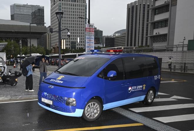 권성동 국민의힘 의원이 탑승한 법무부 호송차량이 24일 서울 종로구 KT광화문빌딩 웨스트에 마련된 김건희 특검(특별검사 민중기) 사무실로 향하고 있다. 특검팀은 이날 권 의원과 한학자 통일교 총재를 소환해 정교유착 등의 혐의를 집중 조사할 계획이다.