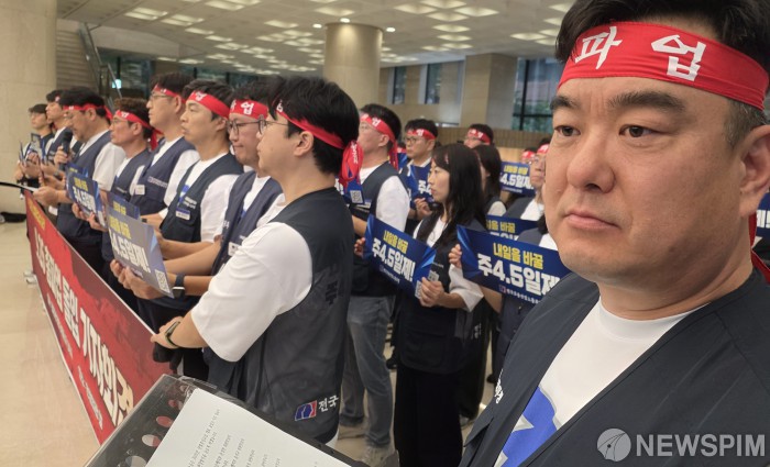 [서울=뉴스핌] 양윤모 기자 = 전국금융산업노동조합(금융노조)이 24일 오후 서울 중구 은행회관 앞에서 김형선 위원장이 참석한 가운데, 주 4.5일제 시행과 임금 인상 등을 요구하는 9.26 총파업 돌입 기자회견을 개최하고 있다.금융노조는 오는 26일 광화문 세종대로에서 총파업을 예고했으며 은행원들이 거리로 나서는 은행권 총파업은 2022년 9월 이후 약 3년 만이다. 2025.09.24 yym58@newspim.com