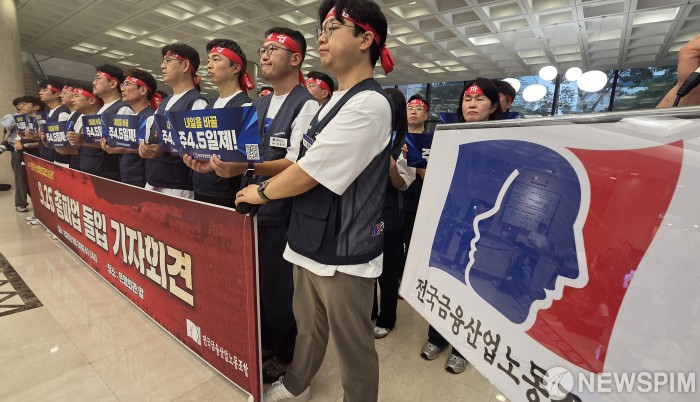 [서울=뉴스핌] 양윤모 기자 = 전국금융산업노동조합(금융노조)이 24일 오후 서울 중구 은행회관 앞에서 김형선 위원장이 참석한 가운데, 주 4.5일제 시행과 임금 인상 등을 요구하는 9.26 총파업 돌입 기자회견을 개최하고 있다.금융노조는 오는 26일 광화문 세종대로에서 총파업을 예고했으며 은행원들이 거리로 나서는 은행권 총파업은 2022년 9월 이후 약 3년 만이다. 2025.09.24 yym58@newspim.com