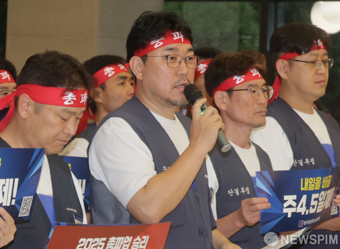 [서울=뉴스핌] 양윤모 기자 = 김형선 전국금융산업노동조합(금융노조) 위원장이 24일 오후 서울 중구 은행회관 앞에서 주 4.5일제 시행과 임금 인상 등을 요구하는 9.26 총파업 돌입 기자회견에서 발언을 하고 있다.금융노조는 오는 26일 광화문 세종대로에서 총파업을 예고했으며 은행원들이 거리로 나서는 은행권 총파업은 2022년 9월 이후 약 3년 만이다. 2025.09.24 yym58@newspim.com
