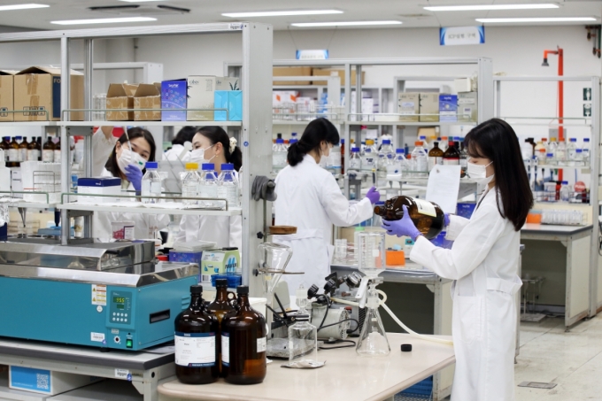 계명대 TMR센터 연구원들이 식품 성분을 분석하고 있다./사진제공=계명대 |