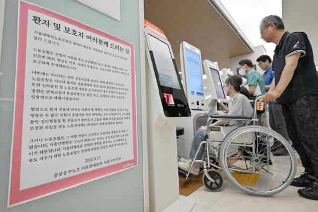 24일 서울 종로구 서울대병원 본관에 공공운수노조 의료연대본부 서울대병원 분회 조합원들의 파업 관련 성명이 게시돼 있다. 서울대병원 노조는 의료 공공성 강화 등을 요구하며 이날부터 무기한 전면 파업에 돌입했다. 민경석 기자 |