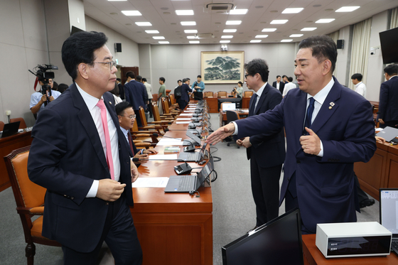 국회 운영위원장인 김병기 더불어민주당 대표 직무대행 겸 원내대표와 송언석 국민의힘 비상대책위원장 겸 원내대표가 29일 서울 여의도 국회에서 열린 운영위원회 전체회의를 마치고 악수하고 있다. 뉴스1 |