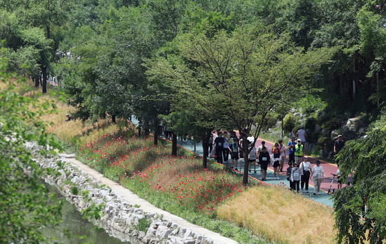 지난 6월 서울 마포구 월드컵천에서 열린 '월드컵천 걷기대회'에서 참가자들이 약 1.4㎞ 구간에 조성된 황금보리밭과 양귀비 꽃길을 따라 걷고 있다. 뉴스1 |