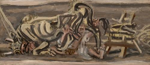 이중섭의 1954년 작 '소와 아동'은 머리를 땅에 대고 엎드린 소와, 그 뒷다리 사이에 앉아 있는 아이를 그린 작품이다.