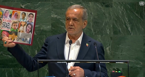 페제시키안 대통령은 지난 6월 이스라엘의 이란 공습으로 시작된 12일간의 무력 충돌 때 사망한 이란 여성과 어린이들의 사진을 들어 보였다.