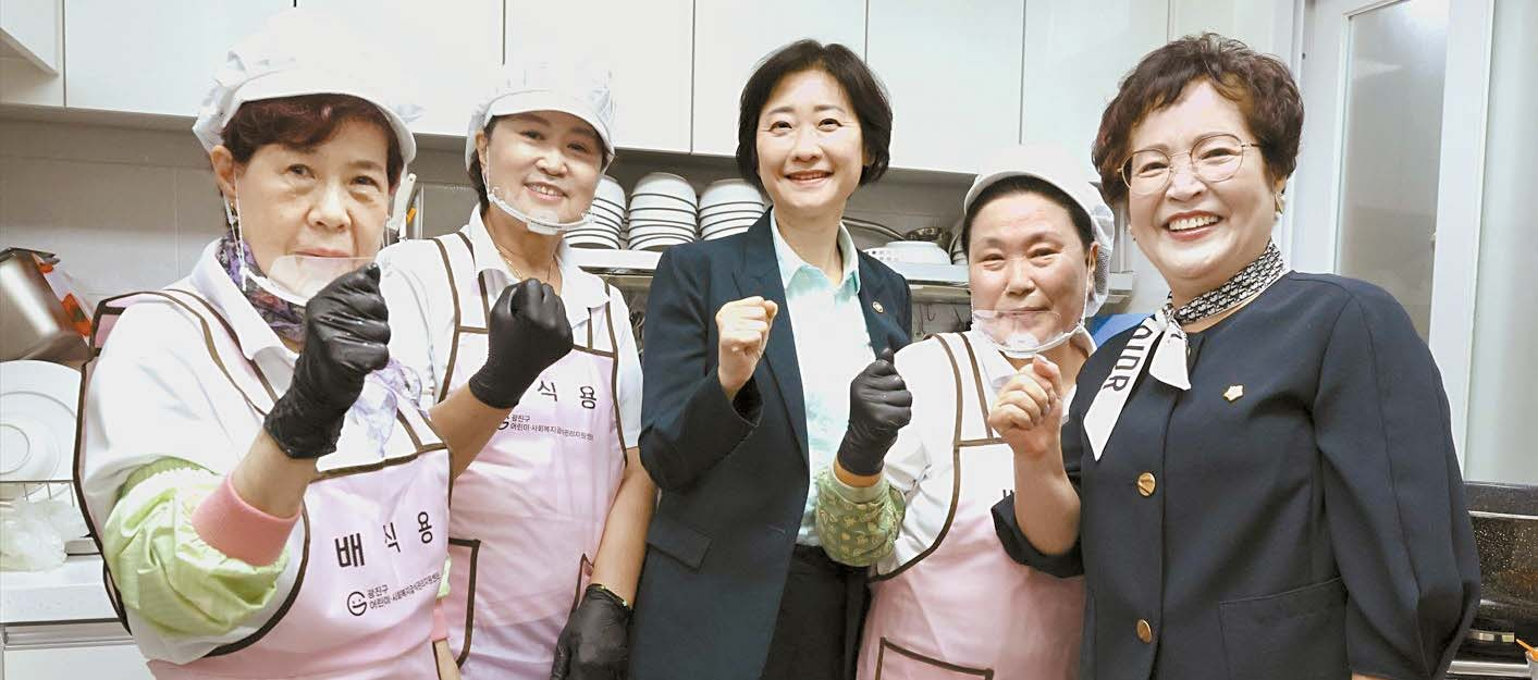 이스란 보건복지부 제 1차관(가운데)이 8월 결식아동 급식 지원 현장을 방문했다. [사진 복지부] |
