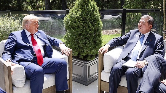 도널드 트럼프 미국 대통령과 이시바 시게루 일본 총리가 지난 6월 16일(현지시간) 주요 7개국(G7) 정상회의를 계기로 캐나다 캐내내스키스에서 회담하고 있다. 일본 내각 홍보실=연합뉴스 |