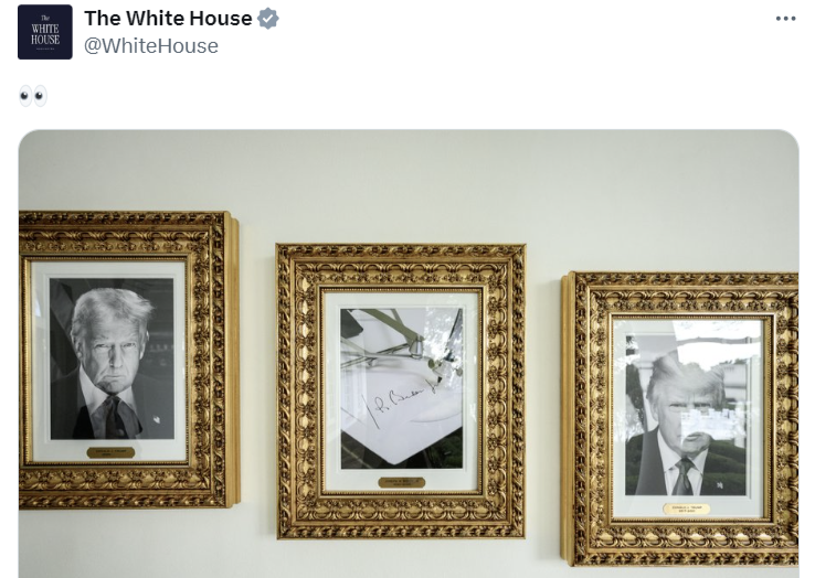 미국 백악관이 24일(현지시간) 공식 엑스 계정에 46대 대통령인 조 바이든 전 대통령의 사진이 걸려야 할 자리에 자동 전자서명 기계인 오토펜 사진이 걸린 사진을 올렸다. 백악관 엑스 갈무리 |