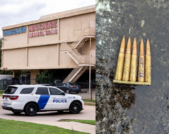 24일(현지시간) 미국 텍사스주 댈러스에 있는 이민세관단속국(ICE) 건물에서 경찰이 총격 사건을 조사하고 있다. 용의자는 이 건물 옥상에서 구금시설을 향해 총격한 것으로 전해졌다. 현장에서 발견된 탄피(오른쪽)에 '안티-ICE'라고 적혀 있다./로이터 연합 |