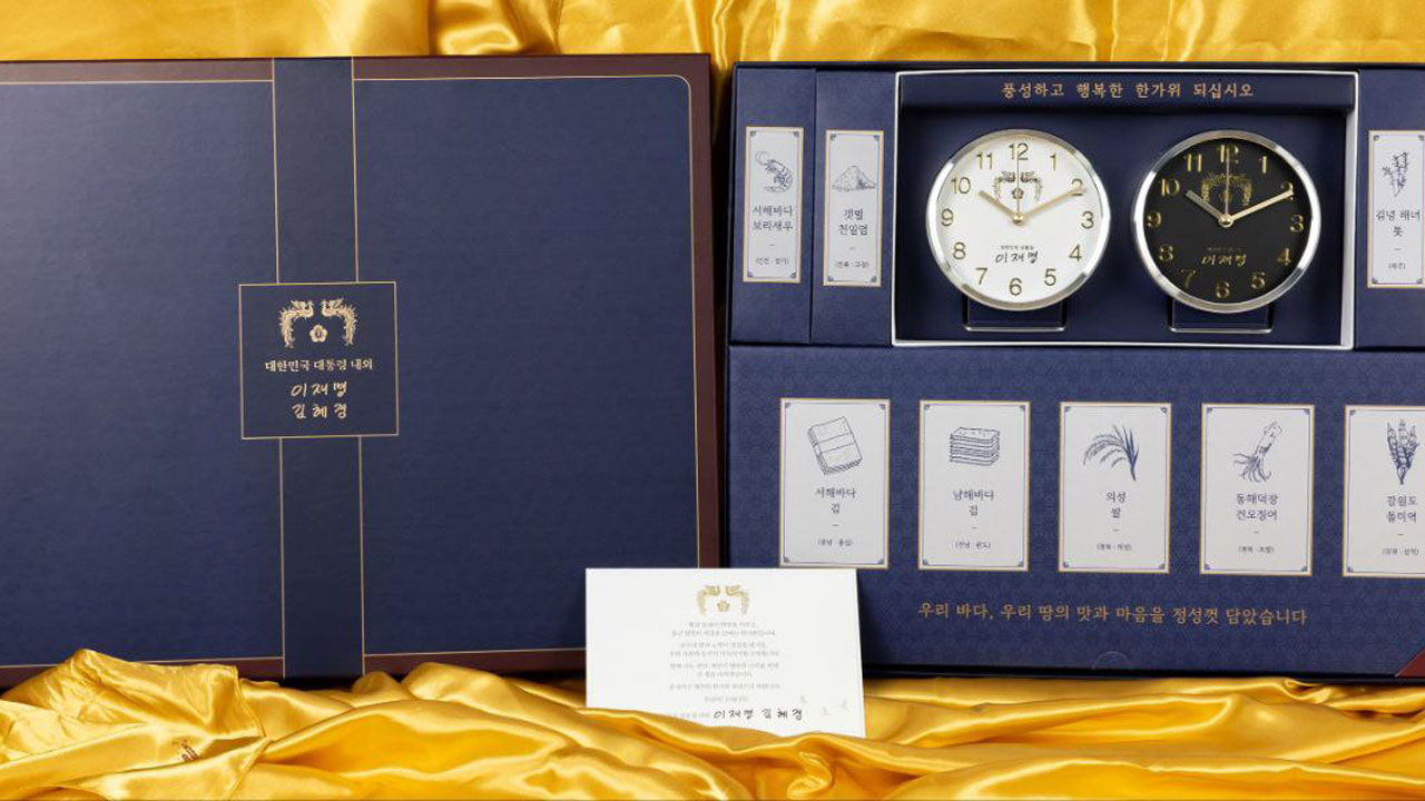 이번 추석 선물은 이 대통령의 서명이 담긴 탁상시계와 8도 수산물, 경북 의성 쌀 등으로 구성됩니다.