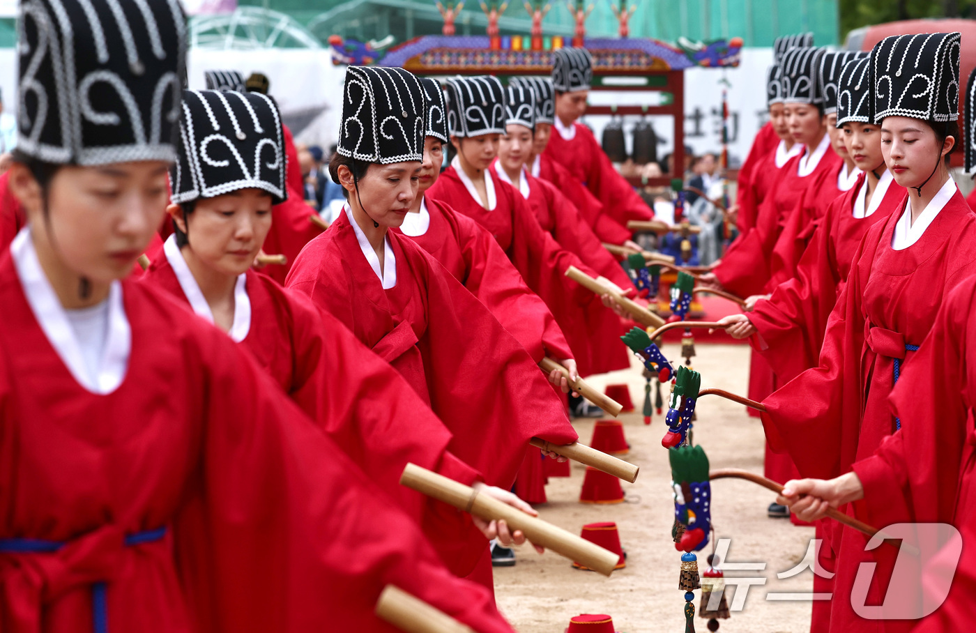 (서울=뉴스1) 구윤성 기자 = 25일 오전 서울 종로구 성균관 비천당에서 열린 추기 석전(釋奠)대제에서 학생들이 팔일무를 추고 있다. 중요무형문화재 제85호로 지정된 석전의례는 성균관과 전국 향교에서 공자와 맹자 등 5현, 우리나라 18현 등 39위에게 악무(樂舞)와 함께 향을 사르고, 폐백과 술을 올리며 축문을 읽는 제사 의식이다. 2025.9.25/뉴스1