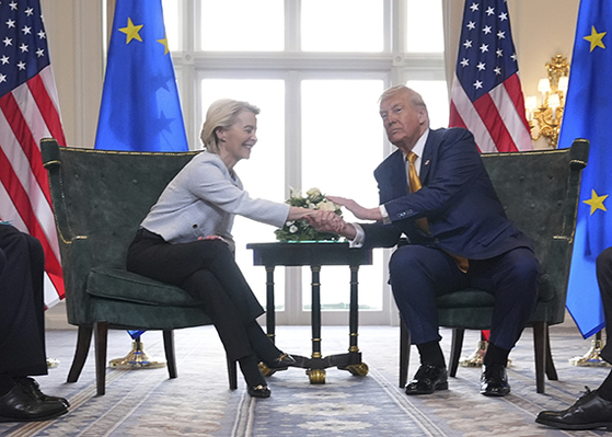 지난 7월 27일(현지시간) 스코틀랜드 턴베리에서 도널드 트럼프 미국 대통령(오른쪽)과 우르줄라 폰데어라이엔 유럽연합(EU) 집행위원장이 무역 협정 타결 소식을 전하며 악수하고 있다. AP=연합뉴스 |