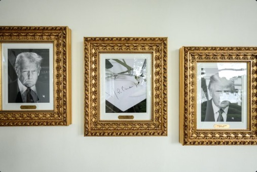24일(현지시간) 로이터통신에 따르면 백악관은 소셜미디어 엑스(X)를 통해 오벌오피스 밖 회랑을 따라 역대 대통령의 사진을 금색 액자에 넣어 나란히 걸어둔 기념 공간 '대통령 명예의 거리' 사진을 두 장 공개했다.